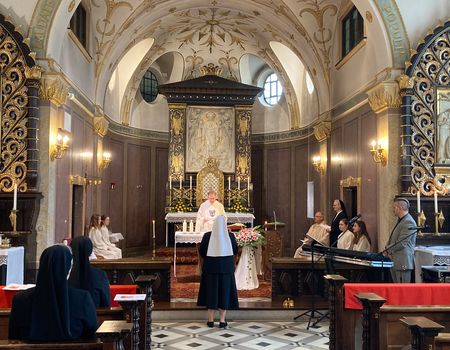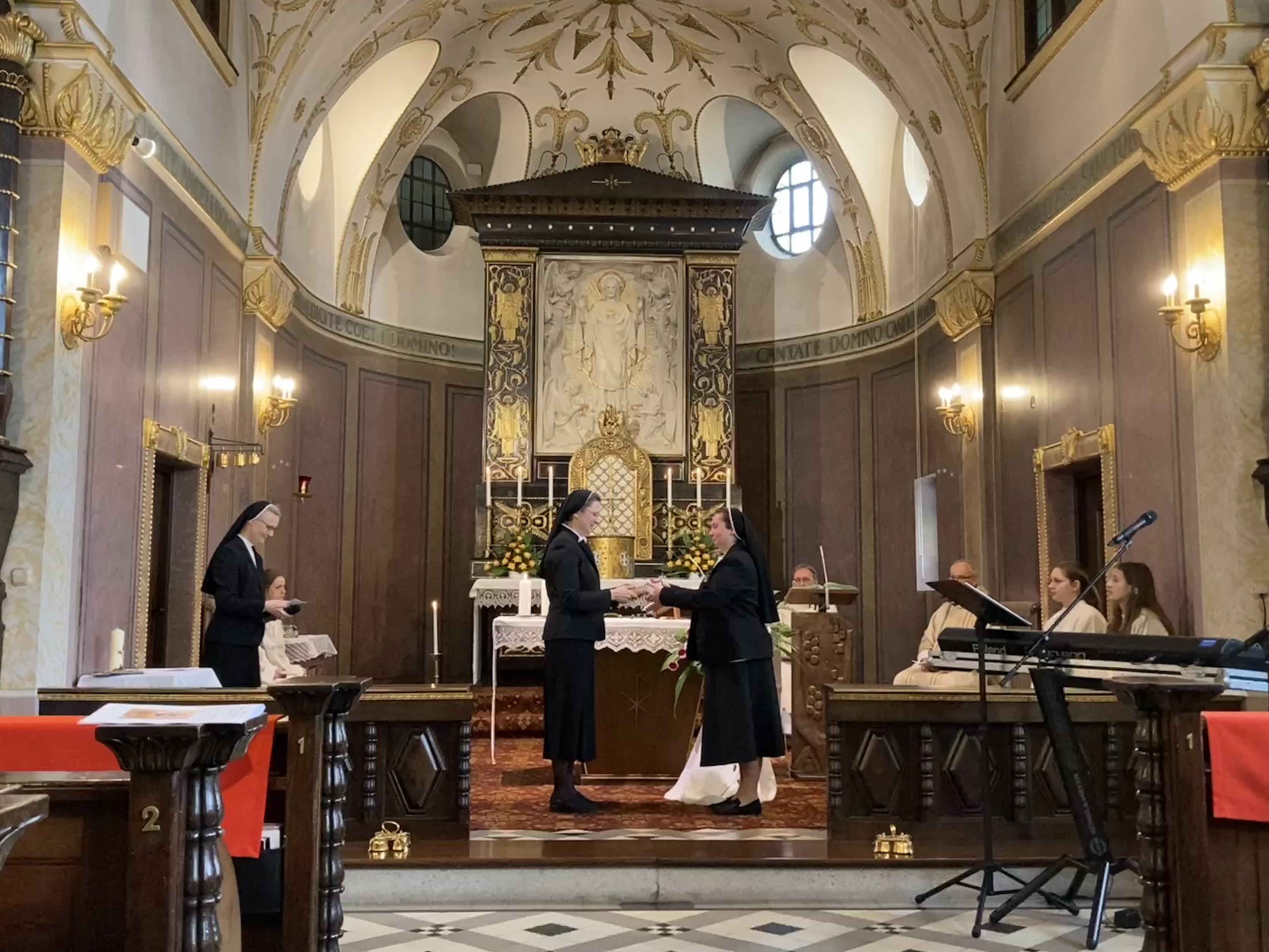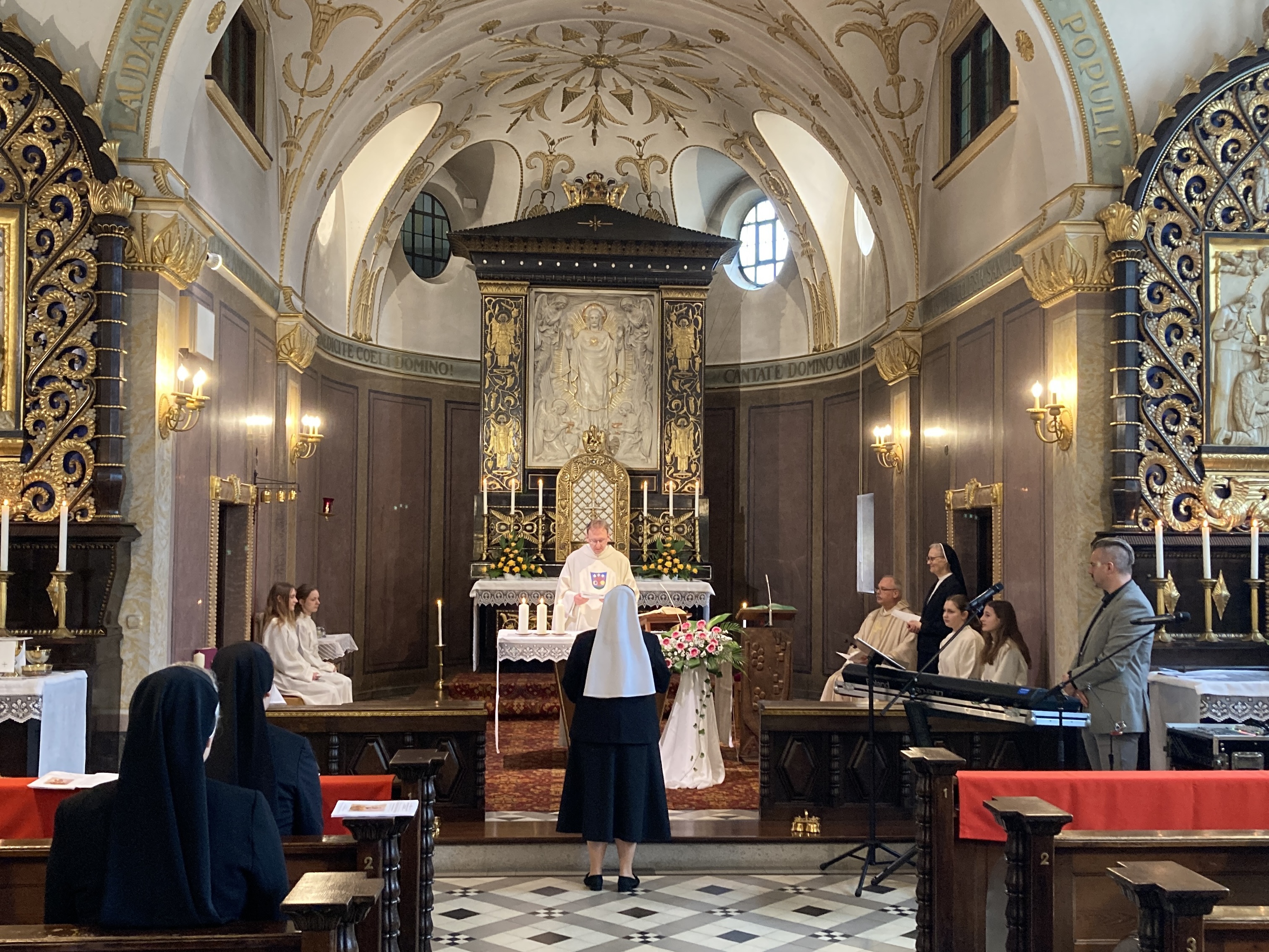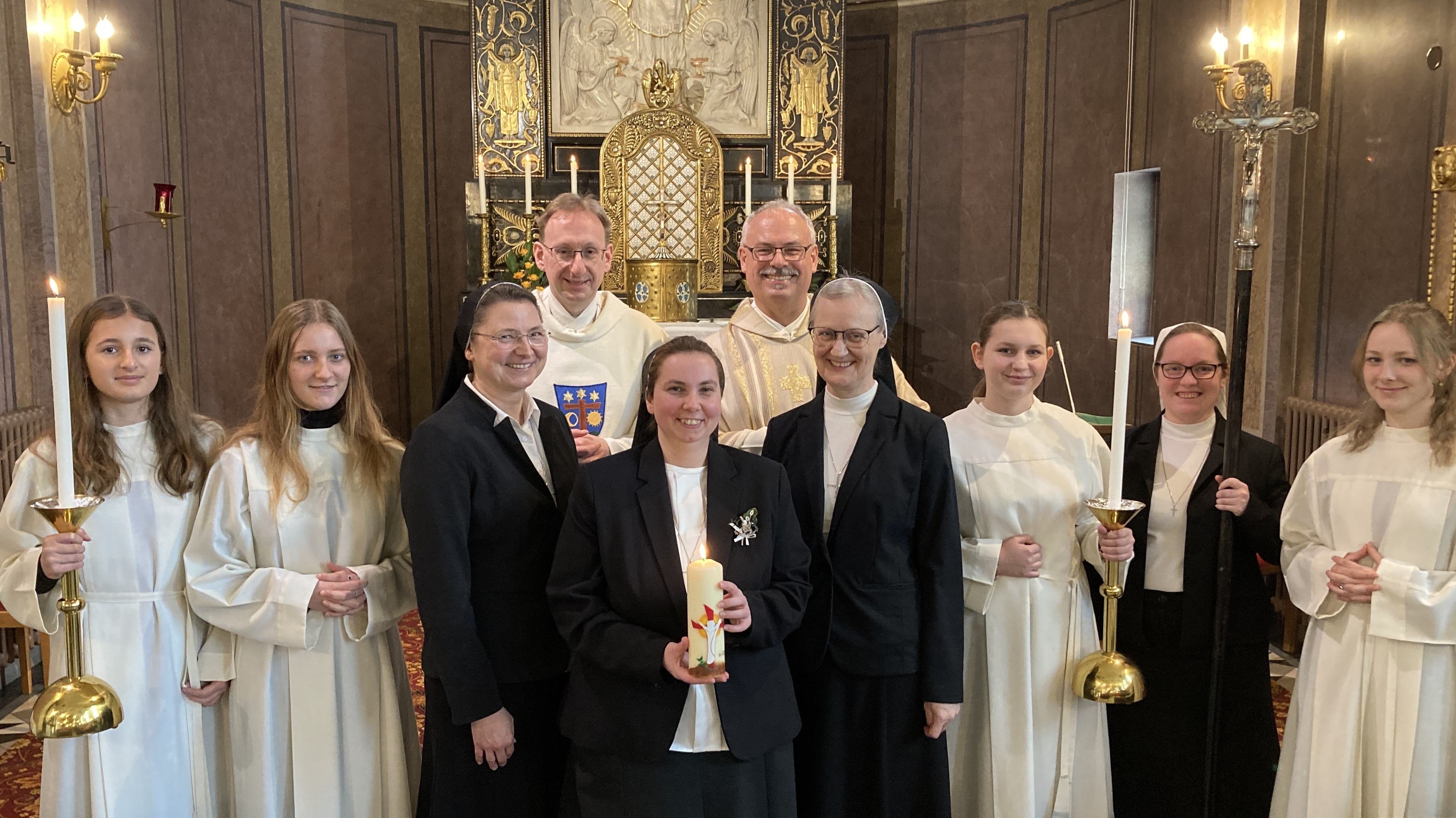 Sr. Hanna hatte ihre Ordensausbildung, bestehend aus dem Postulat und einem zweijährigen Noviziat in München absolviert. Die Ministranten aus dem Pfarrverband Sendling, dem Ort der Ausbildungsgemeinschaft, ließen es sich nicht nehmen, nach Altötting zu fahren, um den liturgischen Dienst bei der Eucharistiefeier anlässlich der zeitlichen Profess zu übernehmen. Pfarrer Dr. Franz Haringer, der Ordensreferent des Bistums Passau, und Prälat Dr. Klaus Metzl, Stadtpfarrer von Altötting, standen der Eucharistie vor. In seiner Predigt hob Haringer hervor, dass die Ordensprofess eine konkrete Form des Lebens aus der Taufe heraus sei. Er betonte weiter: „Wer Jesus Christus, dem Gekreuzigten und Auferstandenen, nachfolgt, steht schon mit mehr als mit einem Bein auf der Seite des Lebens.“