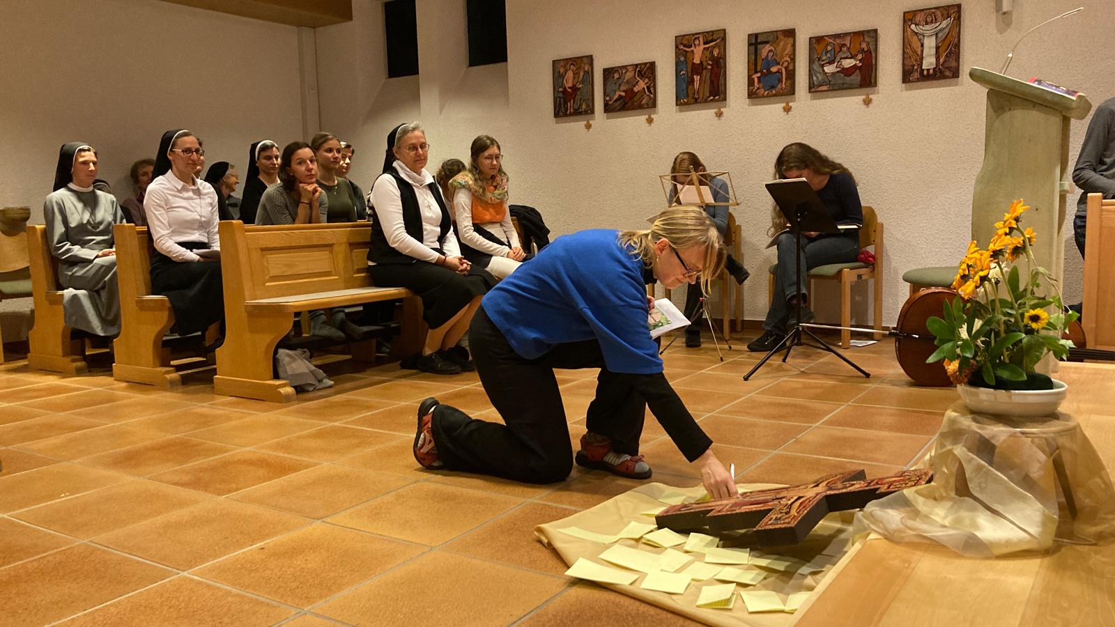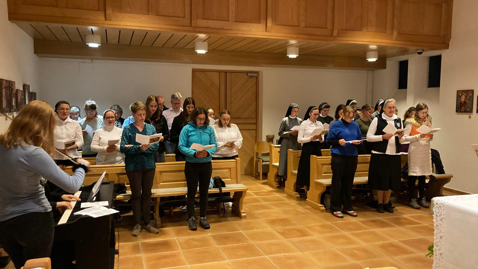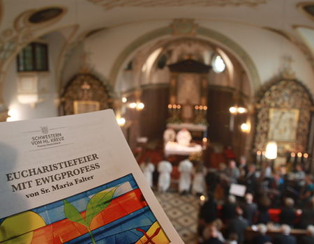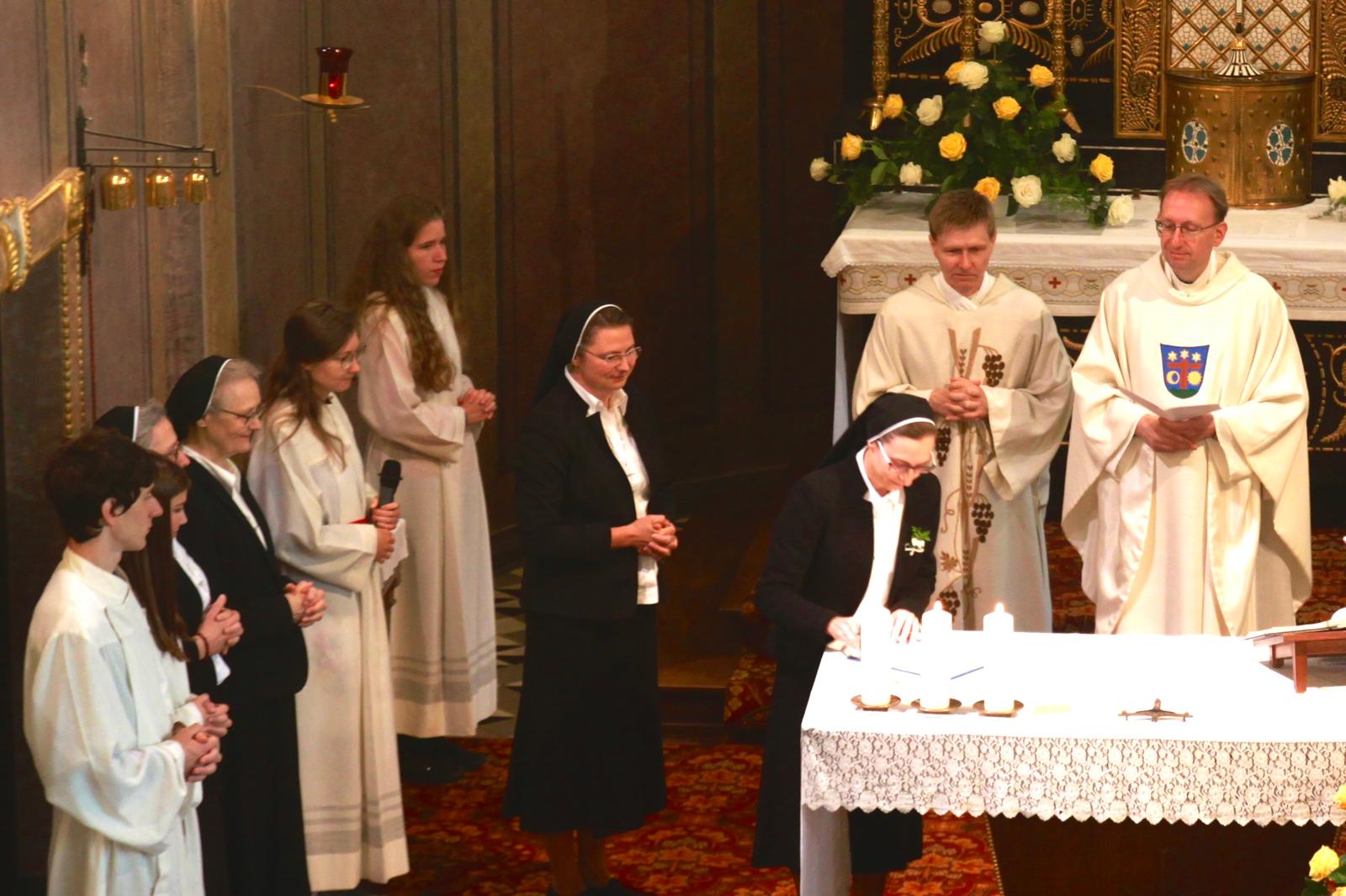 Der Singkreis „Lumen“ aus Burgkirchen am Wald gestaltete die Feier musikalisch lebendig mit. Bei der schwungvoll gesungenen Allerheiligenlitanei wurden die Feiernden spürbar mit hineingenommen in die Schar aller Heiligen. Danach legte Sr. Maria Falter ihre Ewigprofess in die Hände von Provinzoberin Sr. Marika Wippenbeck ab.