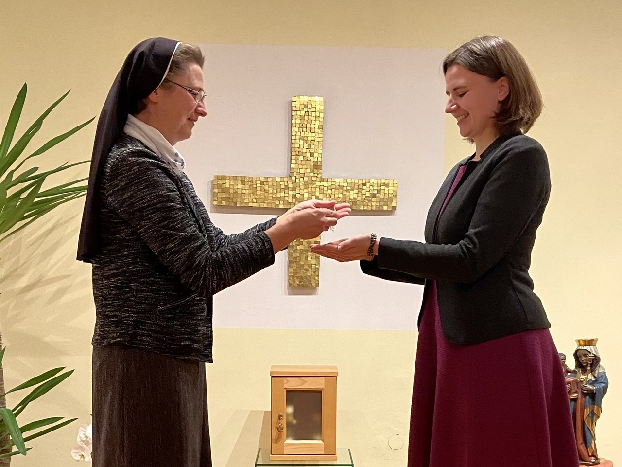 Am Vorabend zum Hochfest Allerheiligen, wurde Svenja in das Postulat aufgenommen. Während der Vesper erklärte die junge Frau, dass sie Mitglied der Schwestern vom Hl. Kreuz werden möchte. Zuvor hatte sie schriftlich um Aufnahme in den Orden gebeten.