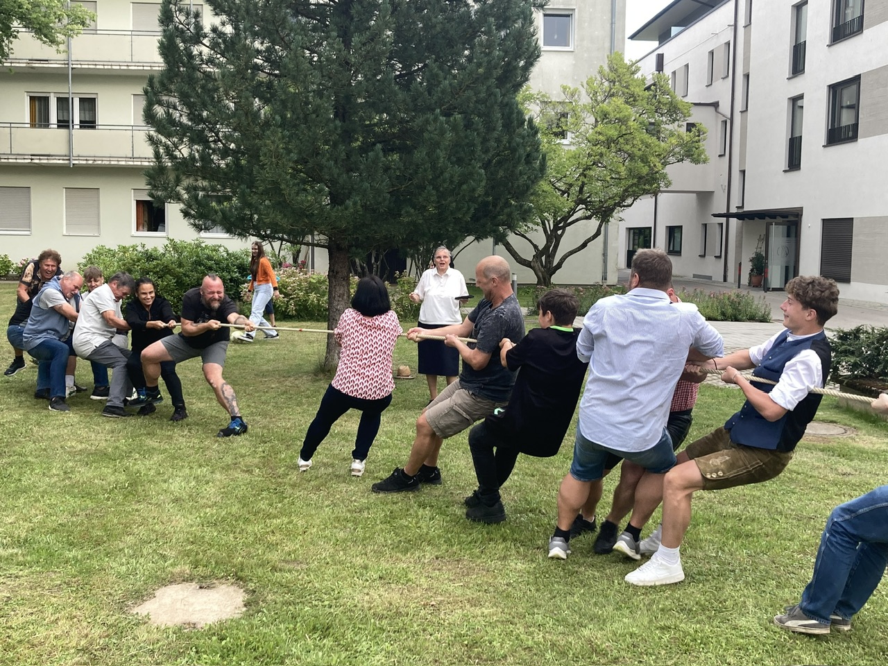 Ein besonderer Moment war, als Sr. Marika und Sr. Clarissa ihre Wertschätzung und ihren Dank an drei Mitarbeiterinnen ausdrückten, die nach jahrzehntelangem Dienst im Provinzhaus in den Ruhestand verabschiedet wurden. Die zahlreichen Gespräche, das vielfältige Angebot an Spielen für die Kinder und das Tauziehen der Mitarbeitenden zeugten von dem guten Miteinander der Dienstgemeinschaft, das weit über den geselligen Abend hinausreicht.
