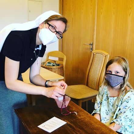 Einige Schwestern standen den Kindern bei so manch kniffliger Perle bei. Auch eine Katechese folgte. Mit Eifer und Neugier waren die Kinder rege beteiligt. Daneben kamen sie mit den Schwestern über Gott und deren Lebenswelt im Orden ins Gespräch.